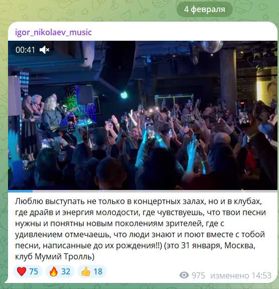 Люблю выступать не только в концертных залах, но и в клубах, где драйв и энергия молодости, где чувствуешь, что твои песни нужны и понятны новым поколениям зрителей, где с удивлением отмечаешь, что люди знают и поют вместе с тобой песни, написанные до их рождения!!) (это 31 января, Москва, клуб Мумий Тролль)