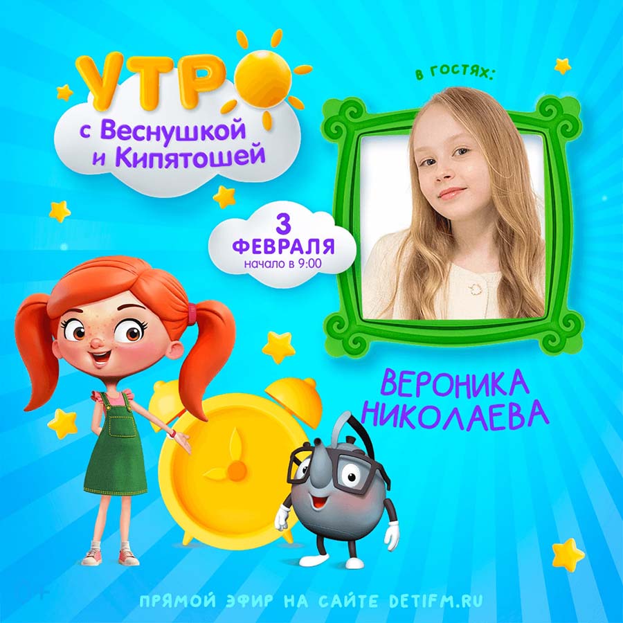 В гости к Веснушке и Кипятоше в утренний эфир «Детского радио» пришла юная певица Вероника Николаева с релизом песни "Небо с голубыми глазами".